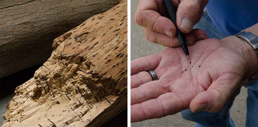 Left: The black holes and chambers in this box elder's wood indicate damage caused by the polyphagous shot hole borer. Right: Nursery manager Dan Berry holds five polyphagous shot hole borers—each smaller than a sesame seed—in the palm of his hand. Photographs by Lisa Blackburn.