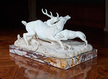 The powerful and expertly conceived Two Hounds Attacking a Deer portrays a deer pulled to the ground by two hounds—possibly referring to the mythological scene of Actaeon being attacked by his own hunting dogs—arranged on a monolithic base of rare colored stone. The work is a second version of one of the most prominent sculptures in the Museo Pio Clementino (the Vatican’s oldest public museum) that Franzoni made to satisfy an avid art market created by the many Grand Tourists visiting Rome.