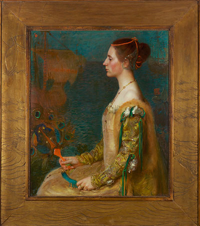 The subject in Woman with a Fan is a topic of some speculation. Her costume and the format of the painting are derived from Italian Renaissance portraits, such as the Huntington’s Portrait of a Woman, by Domenico Ghirlandaio (c. 1490, tempera on panel). A nameplate on the back of the frame reads “Miss Maude Bouvier,” referring to Jacqueline Kennedy’s grandmother. Herter spent time in the Hamptons during the early 1890s near the Bouviers and, in the 1920s, painted portraits of family members, but, because the nameplate is not original to the painting, the model is not known with certainty.