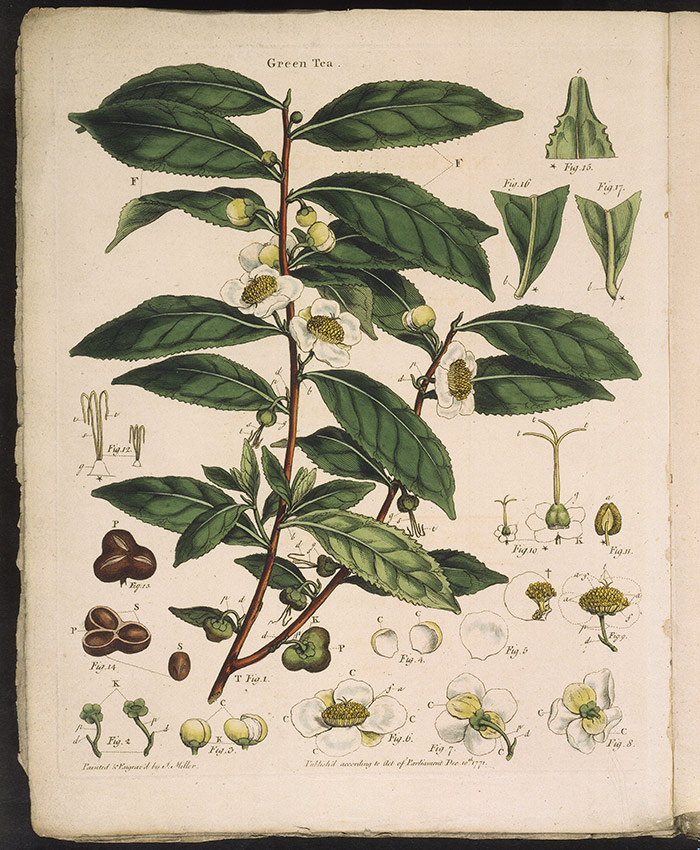 This botanical print of tea appears as the frontispiece for The Natural History of the Tea-tree, 1799, by John Coakley Lettsom, M.D. The Huntington Library, Art Collections, and Botanical Gardens.