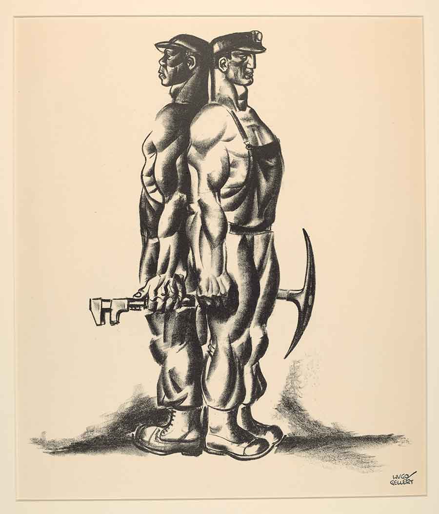 Hugo Gellert, The Working Day 37, 1933. © Hugo Gellert; Courtesy of the estate of the artist and Mary Ryan Gallery, New York. Lithograph, 22 5/8 x 15 3/16 in. (57.5 x 38.6 cm.). This image highlights Gellert’s lithographic talent and reflects his advocacy of racial equality and solidarity.