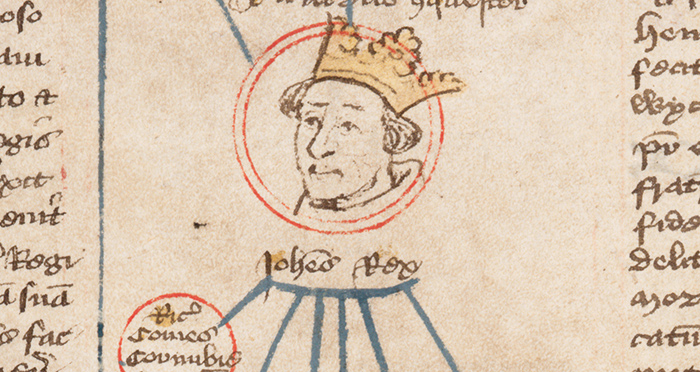 Robin Hood was a fictional character who stole from the rich to give to the poor. His miserly nemesis, Prince John, was the real thing—becoming King of England in 1199. King John appears in this detail from an illuminated manuscript on vellum of the genealogical chronicle of the Kings of England from the late 15th century. The Huntington Library, Art Collections, and Botanical Gardens.