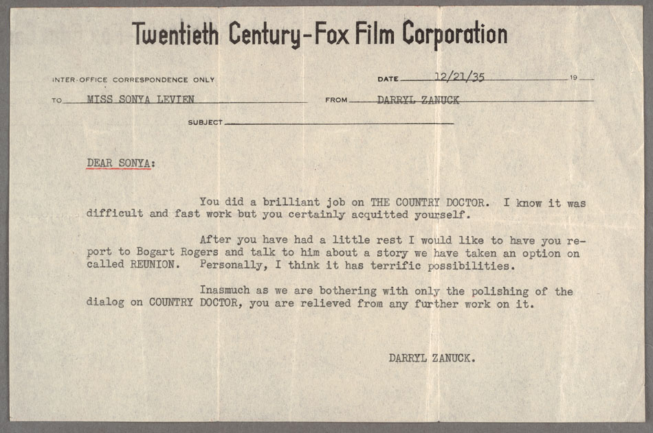 Telegram from producer Darryl Zanuck of Twentieth Century-Fox, congratulating Sonya Levien on the script for The Country Doctor, Dec. 21, 1935. Released in 1936, The Country Doctor starred Jean Hersholt, June Lang, and the Dionne quintuplets in a story loosely based on the birth of the world’s first-known surviving quintuplets. A New York Times reviewer called it “an irresistibly appealing blend of sentiment and comedy.” The Huntington Library, Art Museum, and Botanical Gardens.