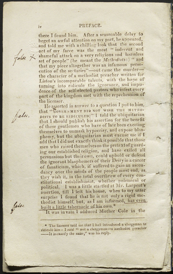 Playwrights occasionally protested their outrage at censorship. In this extract from the preface to Killing No Murder (1809), Theodore Hook insists he had no intention of maligning Methodists in his play. The preface is annotated by an equally irate John Larpent, marking up the falsehoods in Hook’s account of their meetings. Larpent Collection. The Huntington Library, Art Collections, and Botanical Gardens.