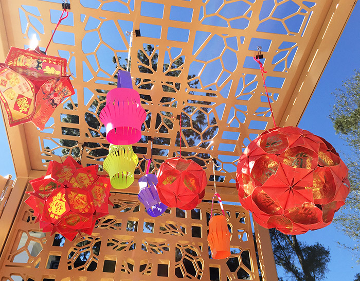 Paper lanterns, some made of red lucky envelopes (laisee or hong bao), enliven the latticework of the new Chinese Garden Discovery Cart.