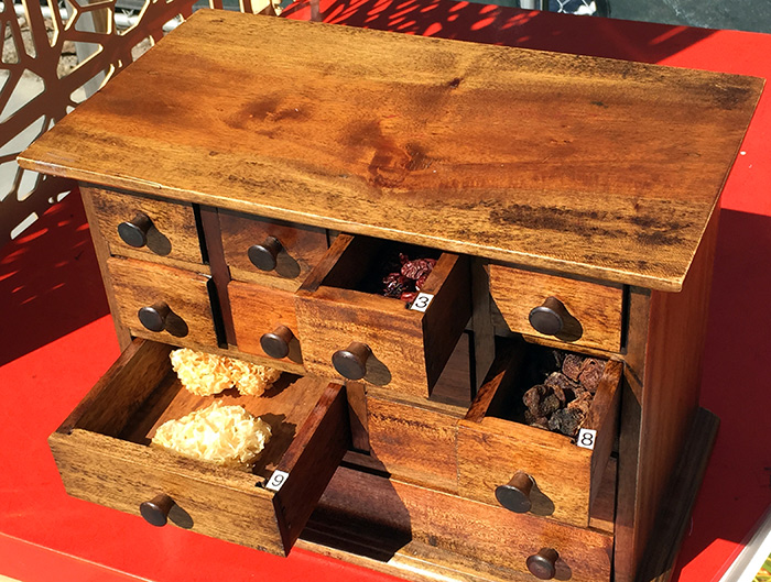 An apothecary box containing: (3) dried Chinese dates, also known as jujube; (8) dried longan; and (9) snow fungus.