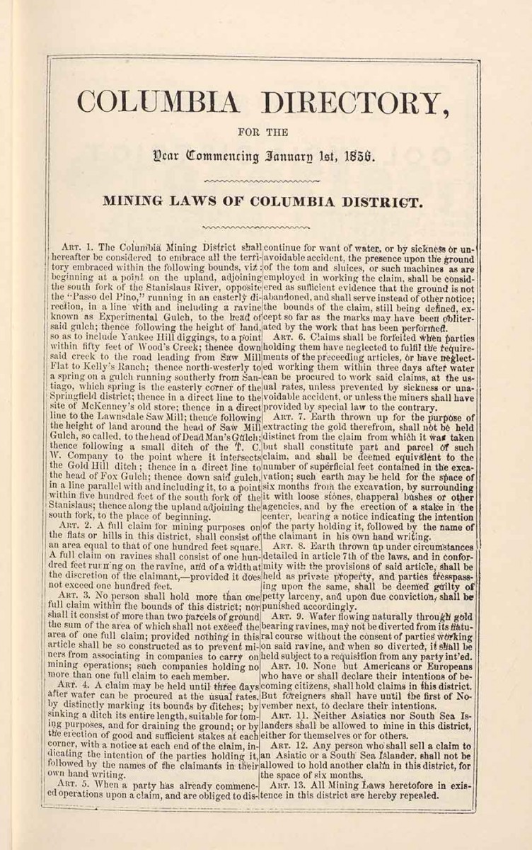 “Columbia Directory with Mining Laws of Columbia District,” from the Miners and Business Men’s Directory, originally published in Columbia, California, by Heckendorn & Wilson, 1856. The Columbia District was the only district out of 30 in Tuolumne County that cited the exclusion of Chinese. For example, Article 11 states: “Neither Asiatics nor South Sea Islanders shall be allowed to mine in the district, either for themselves or for others.” The Huntington Library, Art Museum, and Botanical Gardens.