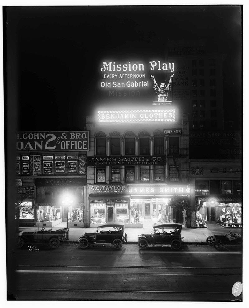 Street scene at night with illuminated sign advertising the “Mission Play” at the San Gabriel Mission. Photograph by G. Haven Bishop, April 12, 1915, from The Huntington’s Southern California Edison Archive.