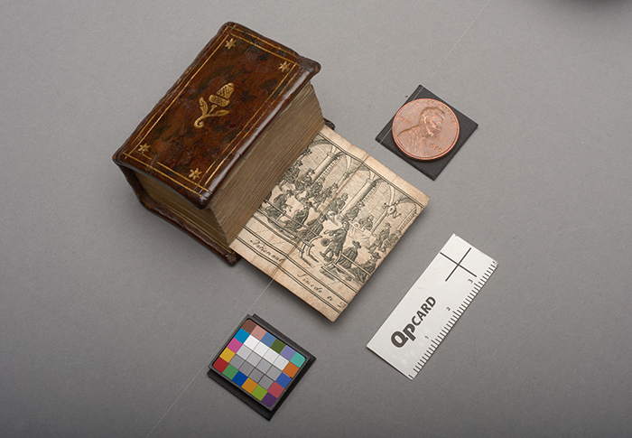 The English Bijou Almanac of 1837. Published by Albert Schloss. Photographing a volume of this size poses unique challenges. In order to take professional images of this and other miniature volumes, Huntington staff constructed a small cardboard stand and used a system of clear strips and conservation thread to hold the volume partly open. The Huntington Library, Art Collections, and Botanical Gardens.