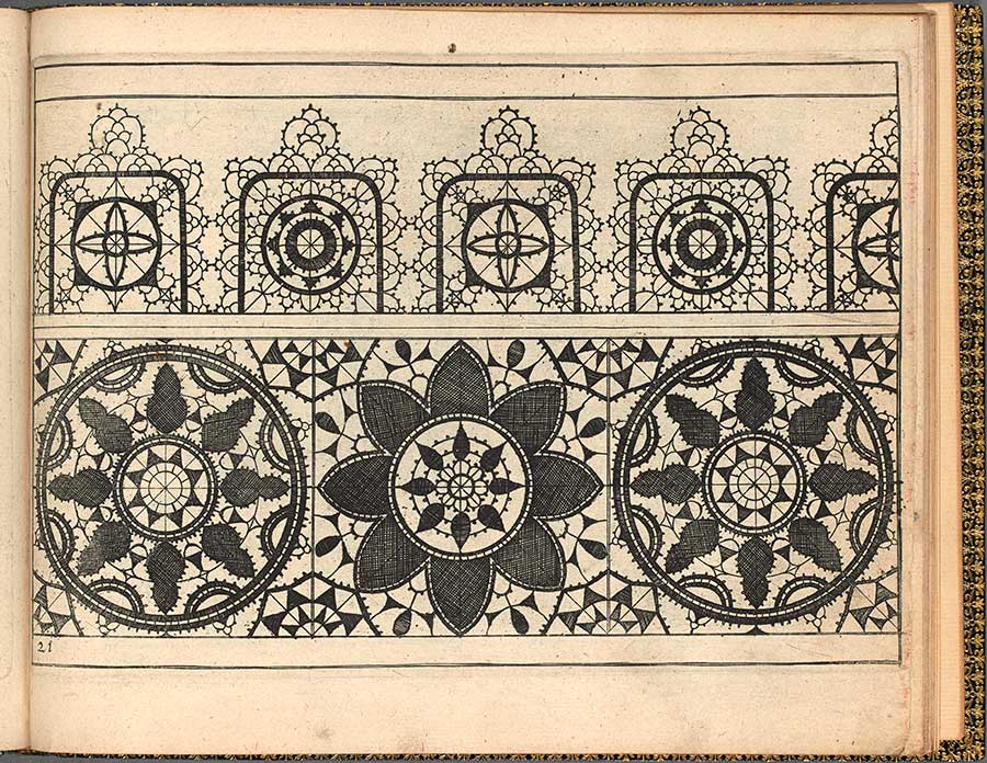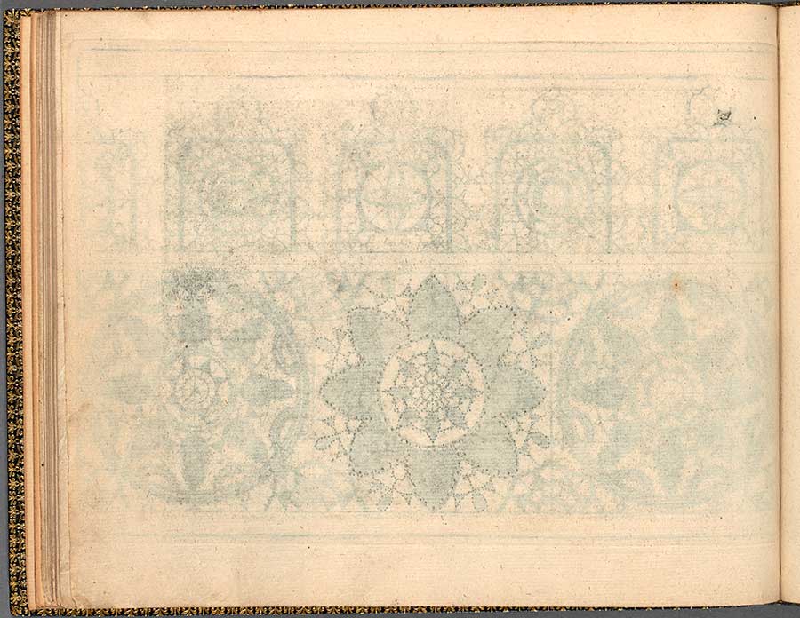 By contrast, pattern books with copper engravings often include only illustrations on the recto. Fortunately, this means that the subtle holes left by needles are more visible on the other side of the page that is frequently left blank, known as the verso.