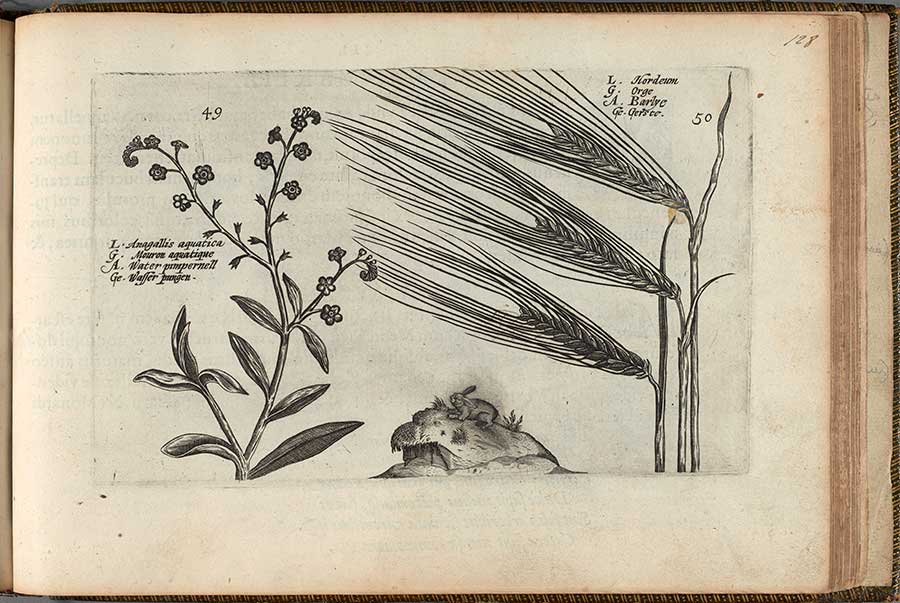 The floral illustrations inspired users to trace with pencil, emulate in pen, and, in some cases, pounce with a needle, revealing many ways early moderns interacted with beautiful, but also practical, designs. For instance, in The Huntington’s copy, one reader has sampled from a page depicting water pimpernel and barley. On the recto, a small rabbit appears to be surrounded by a cloud of dust.