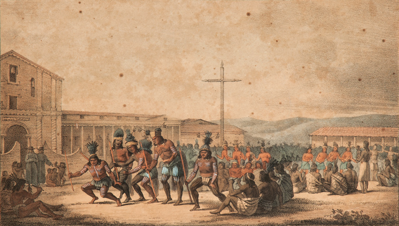 On display in “Junípero Serra and the Legacies of the California Missions” is this print showing Indians performing music and dance at Mission San Francisco. From Louis Choris, Voyage pittoresque autour du monde, 1822, Santa Barbara Museum of Art, gift of Carol L. Valentine.