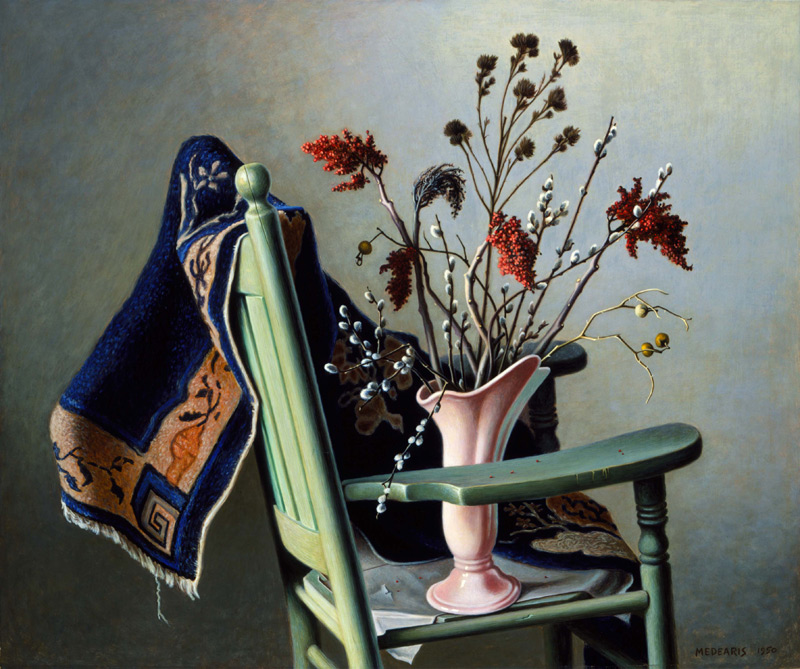 Roger Medearis, Still Life with Green Chair, 1950, tempera on board. Huntington Library, Art Collections, and Botanical Gardens. Gift of Elizabeth Medearis.