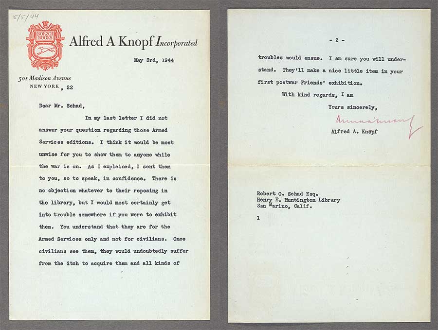In this letter to Curator of Rare Books Robert O. Schad, the publisher Alfred A. Knopf requests that the Armed Services Editions sent to the library for the collection not be exhibited, lest civilians “suffer from the itch to acquire them.” The Huntington Library, Art Collections, and Botanical Gardens.