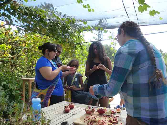 When first-time visitors enter the Ranch, they immediately experience a pleasant rousing of the senses from the hum of bees and hummingbirds, the pungent aroma of herbs and native sages, and the sight of butterflies, lizards, and finches busily making their way around the garden. Here visitors can learn more about their favorite foods, rekindle memories of fruits and vegetables savored during childhood, and discover new foods that grow well locally. Children are delighted when a staff member offers them a taste of a fresh carrot that has just been pulled from the ground or a juicy cherry tomato, plucked from the vine and still warm from the sun. (Most of the harvest is donated to a local nonprofit, Friends in Deed, for their community food bank.)