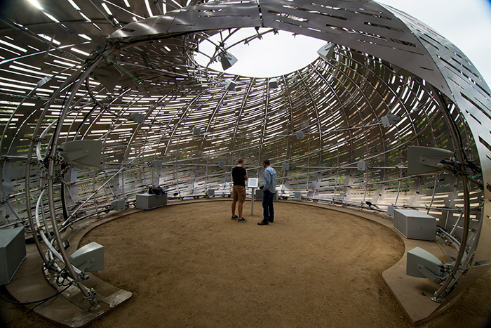 As visual strategists at NASA’s Jet Propulsion Laboratory (JPL), Dan Goods and David Delgado use art and design to explain science. Their newest project is the Orbit Pavilion sound experience, which recently opened at The Huntington. The large silver structure sits on the Celebration Lawn by the terrace of the 1919 café. Inside, visitors can hear sounds representing the movement of the International Space Station and 19 Earth satellites. We asked Goods and Delgado about the thinking behind the project.