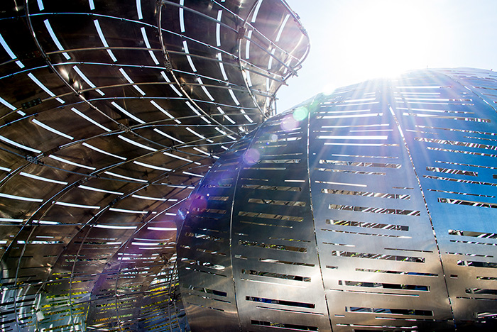 The 72 panels of water-jet cut aluminum are bolted to the frame to create a double-curved shell. Photo by Dan Goods.