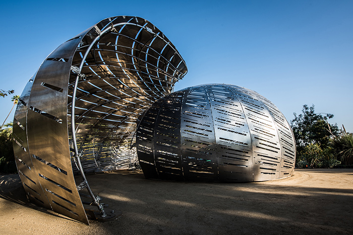 Orbit Pavilion is on view on the Celebration Lawn (across from the Celebration Garden) through Feb. 27, 2017. The Orbit Pavilion kicks off /five, a contemporary arts initiative focused on collaboration between The Huntington and five organizations over a period of five years. The aim is to engage with the Huntington’s library, art, and botanical collections in new and thought-provoking ways.