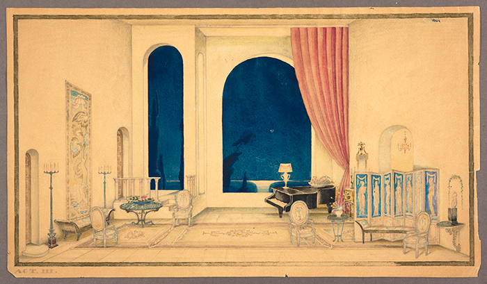 Nielsen’s watercolors possess a dreamy quality, evoking both resplendence and intimacy. The first act takes place in the duke’s house in London. Nielsen’s treatment of the scene shows finely wrought detail and delicate hues that suffuse the furnishings and décor with soft afternoon light. From correspondence in the collection, we know that Nielsen and Akins worked closely to match the arrangement of the furniture to the action.