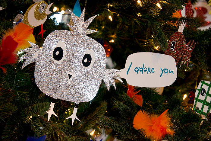 The Huntington Art Gallery has a cool holiday tree again. Last year, a cacophony of colorful piñatas covered the noble fir, a concept developed by designer David Netto. This year, artist Konstantin Kakanias conceived of a tree adorned with whimsical birds whose cartoon speech bubbles silently declared “love,” “freedom,” “harmony,” and “I adore you.”