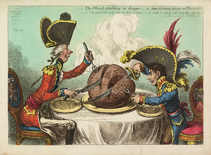 James Gillray, The Plumb-Pudding in Danger–or–State Epicures Taking un Petit Souper, 1805, London. This caricature depicts the imperial powers of Britain and France, represented here by Prime Minister William Pitt the Younger and Emperor Napoleon, carving the globe between them and preparing to devour it. Fittingly, the subtitle notes, “‘the great Globe itself, and all which it inherit’ is too small to satisfy such insatiable appetites.” The Huntington Library, Art Collections, and Botanical Gardens.