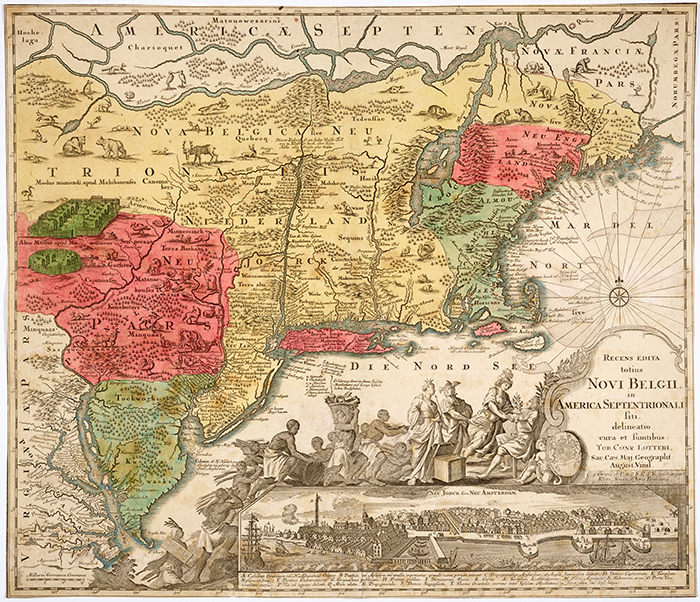 Nicolao Visscher, map entitled Orbis Terrarum Nova et Accuratissima Tabula, 1658, Amsterdam. This image includes the depiction of a procession of enslaved Africans delivering America’s bounty to the English king. The Huntington Library, Art Collections, and Botanical Gardens.