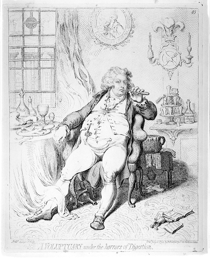 James Gillray, A Voluptuary Under the Horrors of Digestion, London, 1792. This satirical image of an obese George, Prince of Wales and later King George IV, evokes the indulgence of the metropolitan elite during the late 18th century. The Huntington Library, Art Collections, and Botanical Gardens.