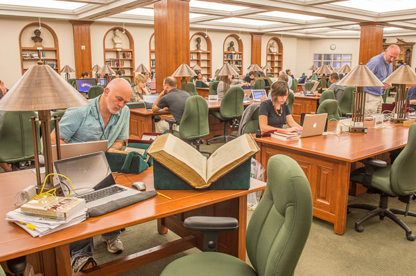 Each year, nearly 200 professors and graduate students receive funding to conduct research here through fellowships ranging from one month to a full year in residence. The grants total $1.7 million, with about 30 percent of the awards going to scholars from outside of the United States. The recipients for 2014–15 are listed here and include scholars who specialize in literature, the history of science, and the American Civil War, among other fields. Many grantees have been arriving throughout the summer and are busy at work in the Ahmanson Reading Room of the Munger Research Center.