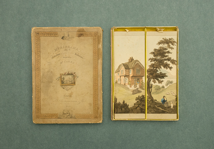 Myriorama: A Collection of Many Thousand Landscapes, Designed by Mr Clark, aquatints by John Heaviside Clark, published by Samuel Leigh, 1824, 16 colored plates in box, 20 x 7 cm. The Huntington Library, Art Collections, and Botanical Gardens.Leigh and Clark adopted the name myriorama and the design of the box that housed the cards from the original French version, in the hopes of inspiring artists to draw attractive landscapes. Their myriorama also introduced the innovation of numbering the bottom of each panel, making it possible to record and later recreate scenes found especially pleasing.