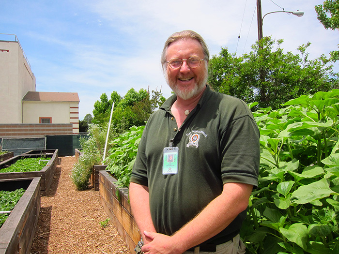 Eliot science teacher Roger Gray in the school’s garden. Photo by Linda Chiavaroli.