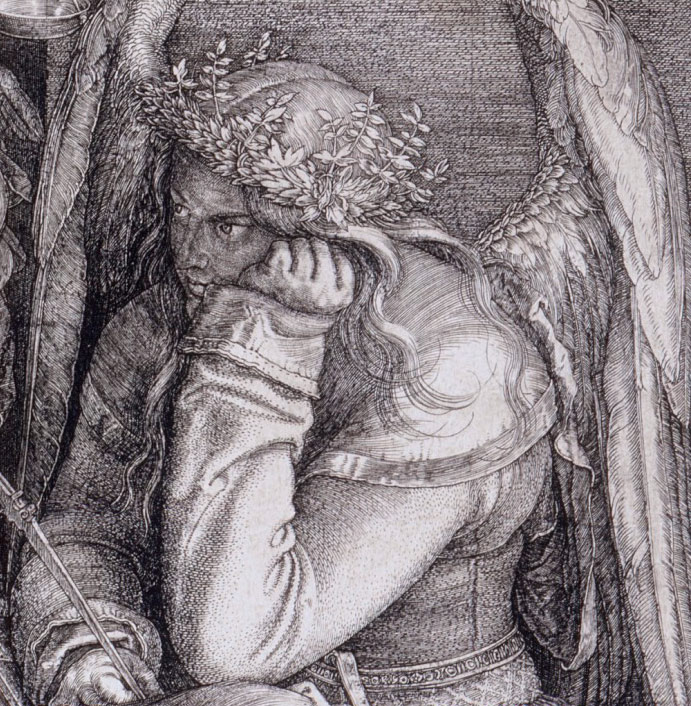 The central character in the print is a winged female figure slumped, her head in her hand, her face dejected and half hidden. So far, not mysterious. But take a look at some of the items that surround her: