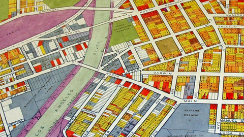 A close-up view shows color-coded parcels of land in the area northeast of downtown, where Broadway crosses the Los Angeles River. Photo by Lisa Blackburn.