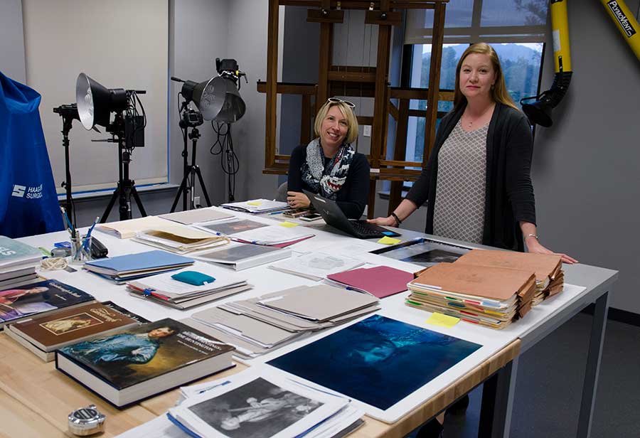 Melinda McCurdy in 2018 with Christina O’Connell, Mary Ann and John Sturgeon Senior Paintings Conservator, preparing for the exhibition “Project Blue Boy.” Photo by Lisa Blackburn.