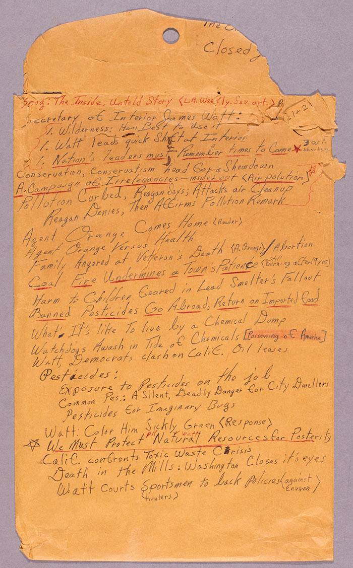 Shelley Streeby, one of the conference presenters, has been studying Butler’s research on the environment and climate change, which Butler initiated in 1965. This image is of the outside of an envelope Butler used to file away the articles she collected on climate and the environment beginning in the 1980s. The Huntington Library, Art Collections, and Botanical Gardens. Copyright Estate of Octavia E. Butler. Click here to enlarge.