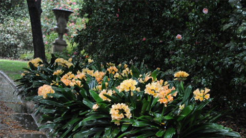 'Victorian Peach' clivias growing along the road between the North Vista and the Library. Photo by Jim Folsom.