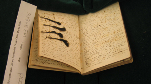 Feathers from a blue quail have been pressed in the diary of Joseph Wood, who traveled overland to California in 1849.