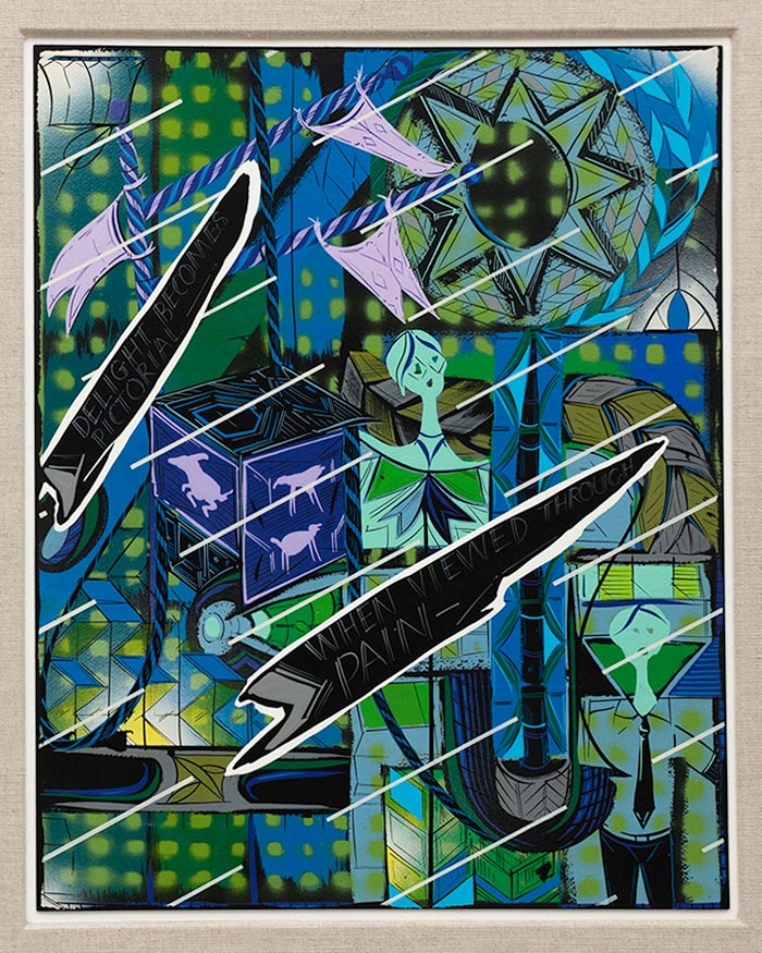 Lari Pittman, from 10 Divinations by Emily Dickinson in Greens and Blues, 2015, acrylic and lacquer spray over gessoed heavy weight, paper board. © Lari Pittman, courtesy of the artist and Regen projects, Los Angeles.