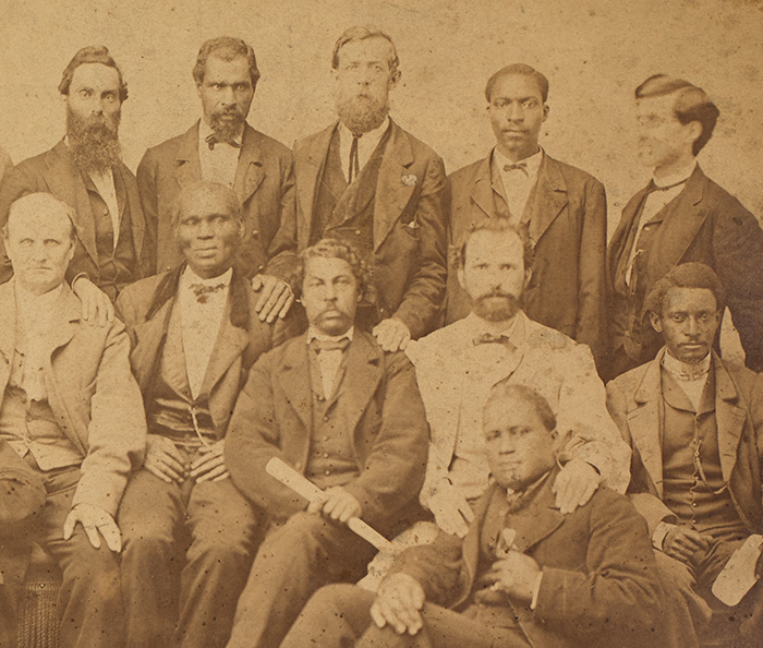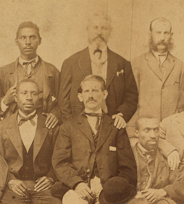 All this research raised more questions than answers. How did Judge Underwood choose these men? And who were they? A few identities came into focus. Lewis Lindsay (seated and holding a scroll in the image above) was a fearless advocate for the confiscation of Confederate lands. Born enslaved in Virginia, Lindsay worked at a Richmond iron works after the war. Albert Royal Brooks (seated second from left in the image above) purchased his and his family’s freedom between 1861 and 1865, and became a respected Richmond businessman and community leader. Joseph Cox (standing far left in the image below) was a free Black man employed as a factory worker, blacksmith, bartender, and storeowner during his lifetime.