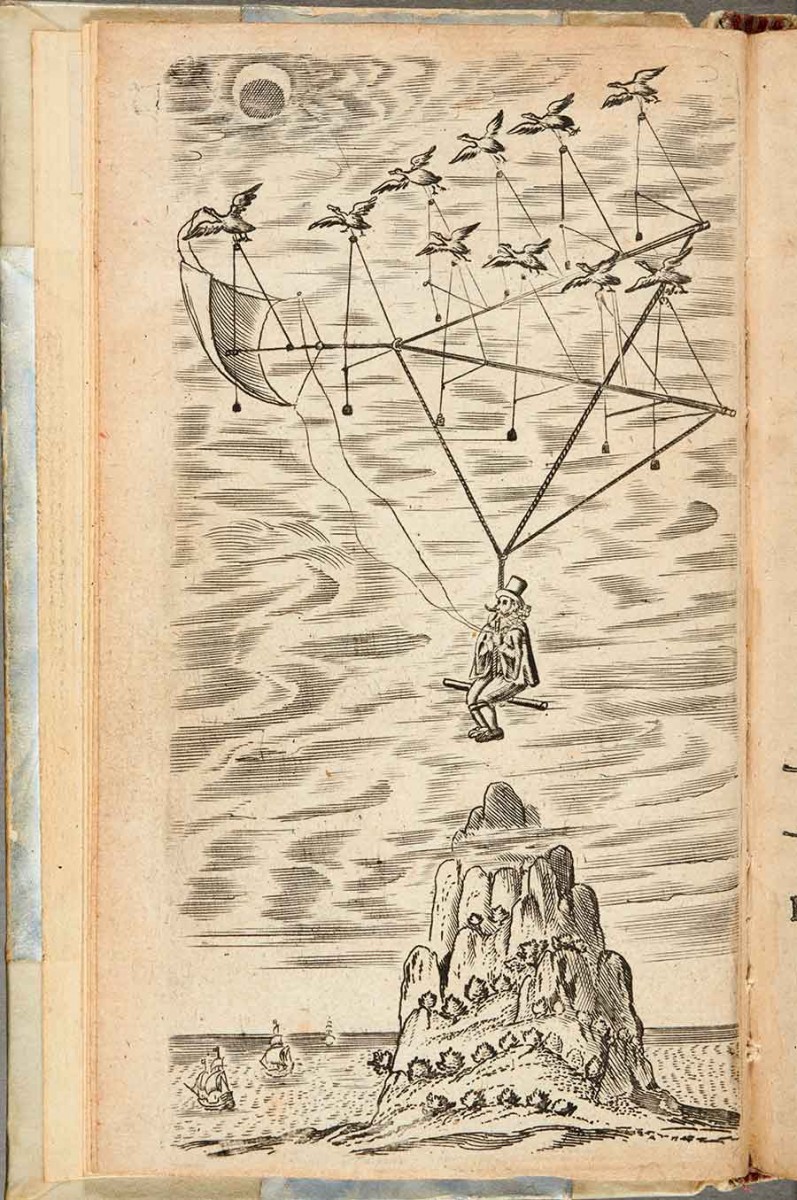 Picture of a flying machine, powered by geese, in Francis Godwin’s The Man in the Moone, 1657, one of the books read by the lunatic Doctor Baliardo in Aphra Behn’s play The Emperor of the Moon, 1687. The Huntington Library, Art Museum, and Botanical Gardens.