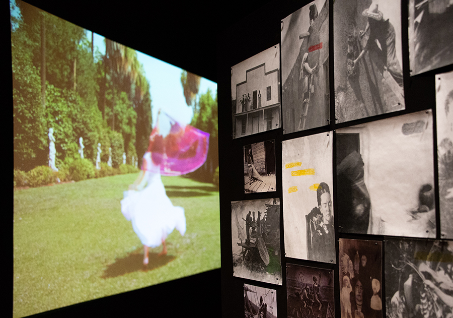 Left: an image from Carolina Caycedo’s video project, Apariciones / Apparitions (2018). Right: a detail of Caycedo’s three-panel screen, To walk in the present looking forward towards the past, carrying the future on our back / Caminar por el presente mirando de frente hacia el pasado, cargando el futuro en nuestra espalda, 2018. Photo by Deborah Miller.