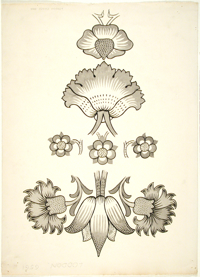 Another example of a drawing used to invent a pattern design is Loddon. It was probably used to train apprentices in the printing workshops or as an aid for woodblock-cutters, providing them with greater clarity of details. The four different shapes of the flowers are represented separately and later assembled to form the pattern. Loddon shows how much attention was paid to every single step in the manufacturing process.