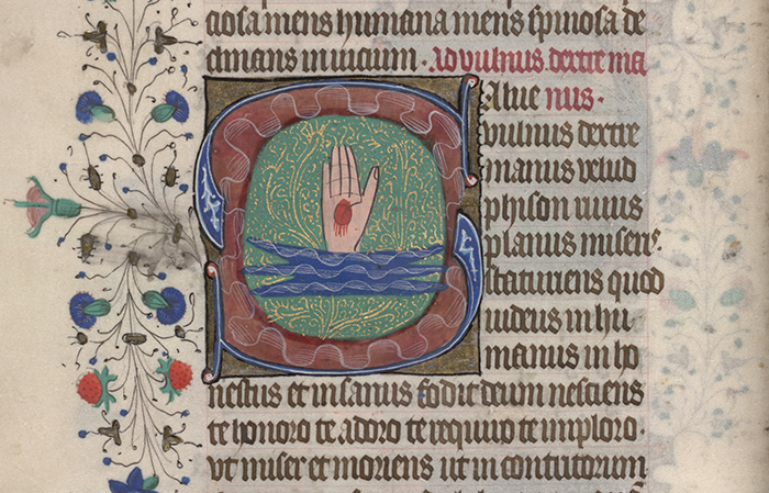 This set of prayers was written in Latin, putting its analogies beyond the reach of some readers. For them, a series of images that sometimes accompanied the prayers provided an intriguing visual translation. These miniature paintings, which appear in two of The Huntington’s books of hours, depict each wounded hand and foot separately, and juxtapose each with a minimalist representation of water. Visually arresting in their own right, they are even more powerful when considered in light of their symbolism, for they suggest not only an analogy, but also an anatomical connection between the flow of the four rivers of paradise and the flow of blood from Christ’s wounds, a connection that also intimates a passage to paradise through worship of the wounds.