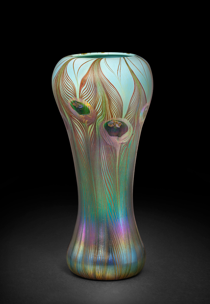 The exhibition surveys the full range of Tiffany’s Favrile glass vase production, from experimental pieces made in the 1890s to the widely admired peacock vases produced in the early years of the 20th century.
