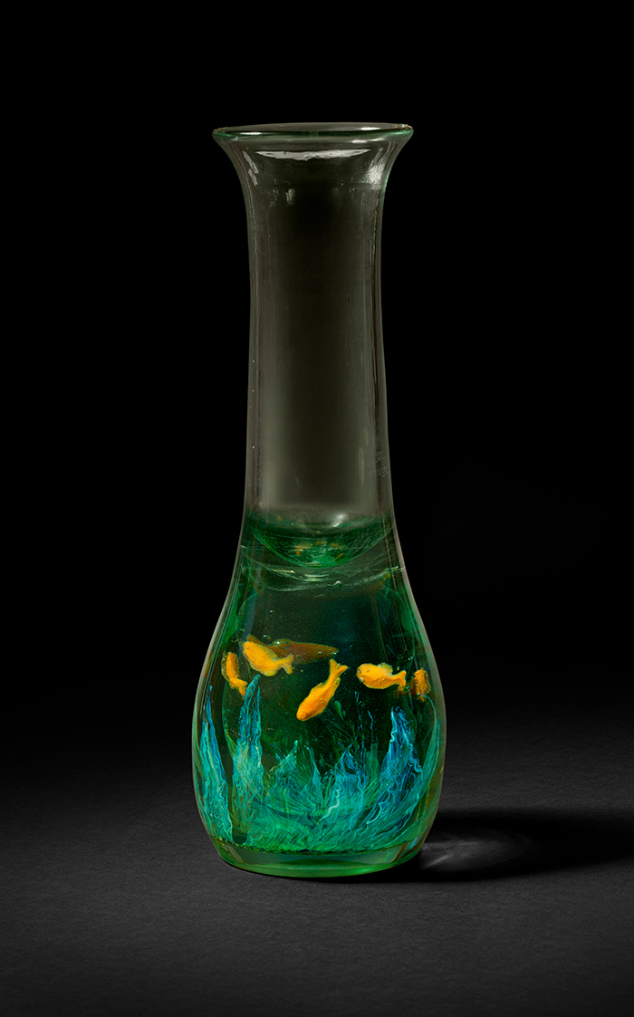 Creating this type of vase was a two-step process. First, the decorative elements—here, orange fish flitting through seaweed—were made by heating colored glass rods and forming them into organic shapes. Then, the shapes were encased in a large mass of blue-green glass. The effect is stunning, and even more so in person.