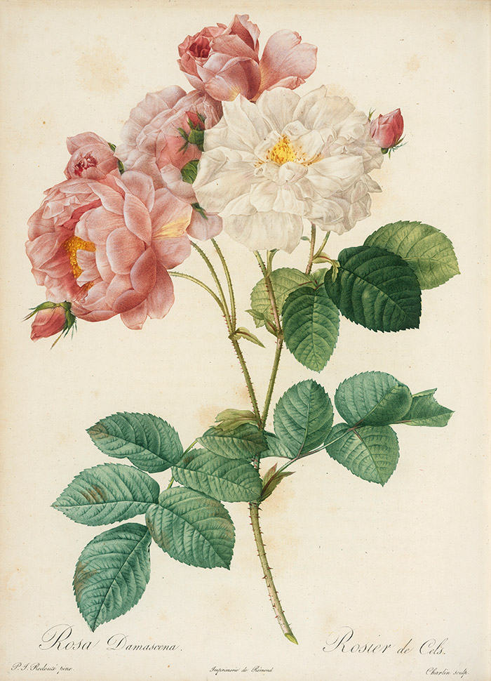 This watercolor of Rosa damascena (of which ‘Autumn damask’ is one of two varieties) is by Pierre-Joseph Redouté, Les Roses, 1817–24. The Huntington Library, Art Collections, and Botanical Gardens.