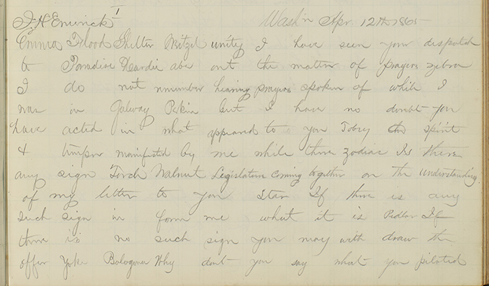 Encoded telegram from President Lincoln to General Weitzel, April 12, 1865, from a ledger of the United States Military Telegraph, War Department, Jan. 21, 1864–Dec. 7, 1865. The Huntington Library, Art Collections, and Botanical Gardens.
