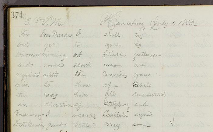 Decoded telegram from General Darius N. Couch to General George G. Meade, 3:10 p.m., Harrisburg, Pa., July 1, 1863. The last four words, great battle very soon, were added by the telegraph operator and presage the Battle of Gettysburg. The Huntington Library, Art Collections, and Botanical Gardens.