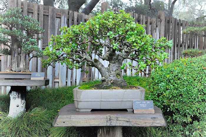 The rugged trunk, twisting branches, and broad canopy of this coast live oak bonsai displays all the signature characteristics of a full-size oak. Photo by Andrew Mitchell.