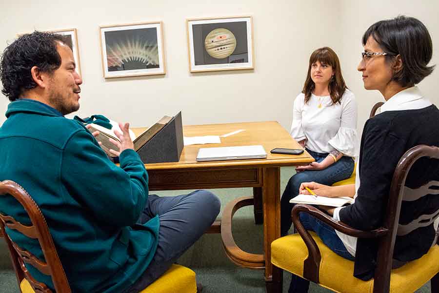 Rosten Woo (left), William A. Moffett Curator of Medieval Manuscripts and British History Vanessa Wilkie (center), and freelance journalist Carribean Fragoza (right) met at The Huntington to discuss Thomas More’s Utopia (1516) and Woo’s desire to create artistic works that help people reorient themselves to place. Photo by Kate Lain.