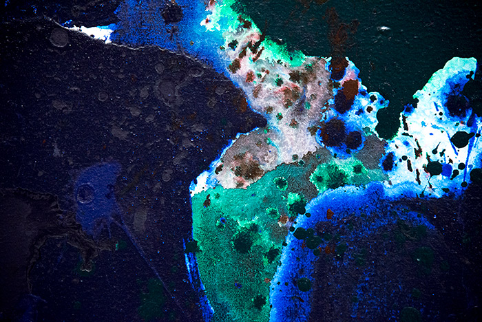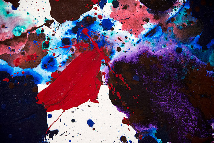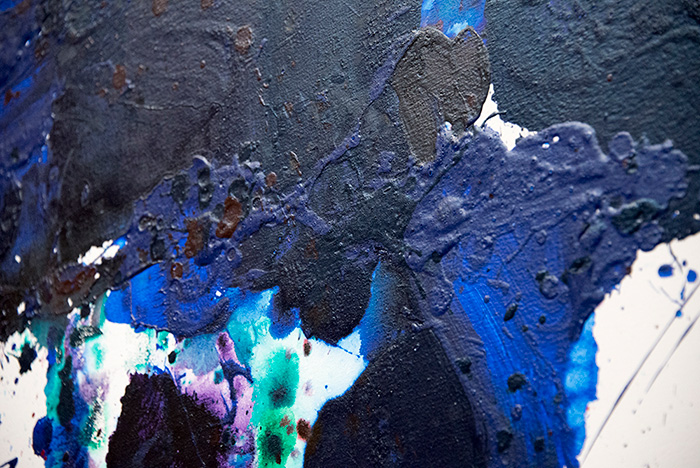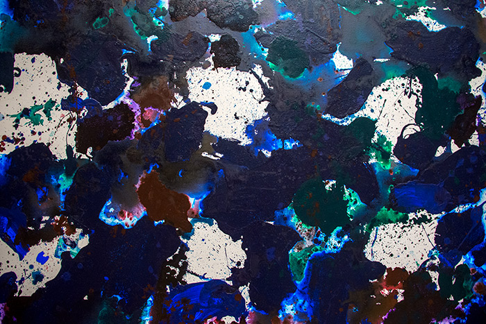 One of his more unusual techniques was using Photo-Flo, a wetting agent for developing film, which gives the surface a watercolor-like quality. Applying Photo-Flo caused the colors to run together and merge in varying ways, producing unexpected shapes and designs from a seemingly random technique. With Photo-Flo and other means, Francis varied the surface texture and the degree to which it reflects light. Some areas are glossy, others matte; some smooth, others richly textured.
